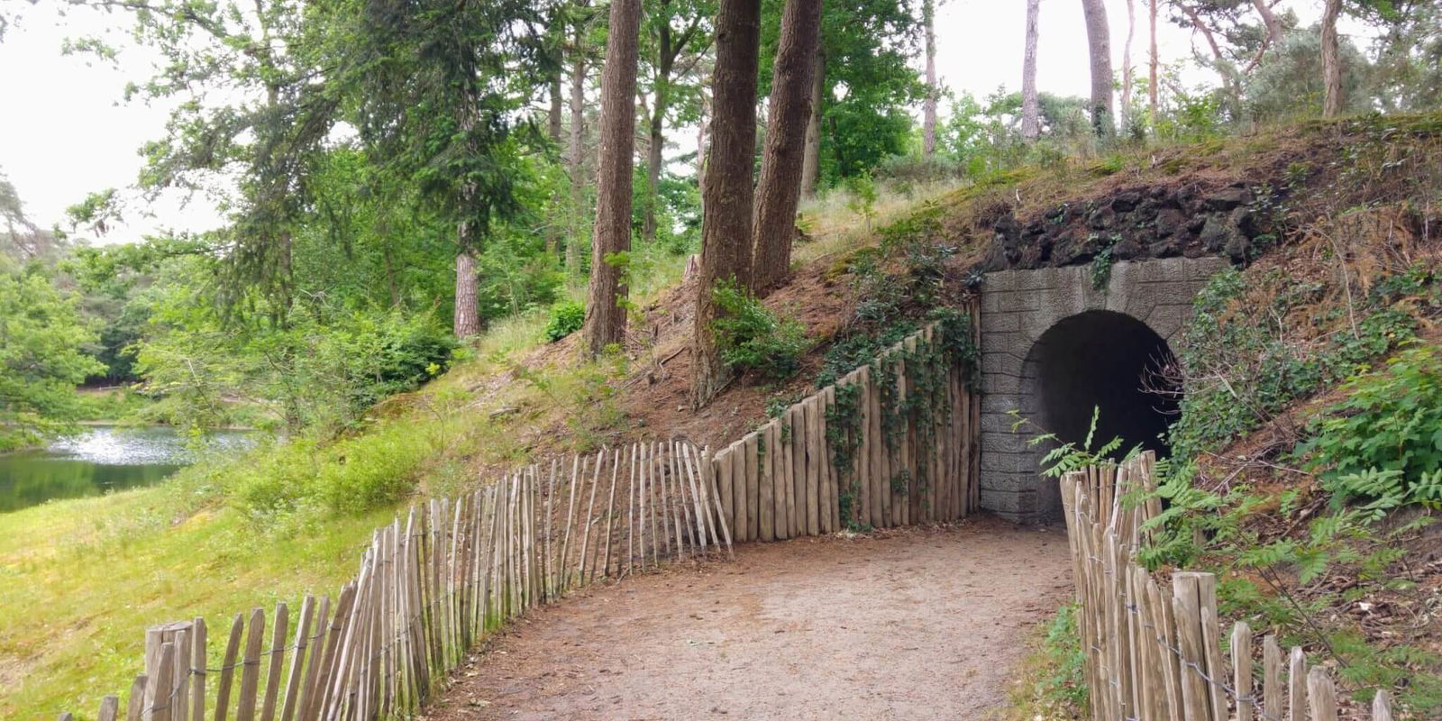Je loopt onderweg door spannende, donkere tunneltjes, komt langs een mooie klimboom en gaat langs bij de schaapskooi. De tunneltjes werden gemaakt door een rijke familie die hier vroeger woonde. Deze familie legde ook een spoorlijn aan zodat ze met hun eigen trein konden reizen. De resten van de spoorlijn vind je nog terug in het bos.