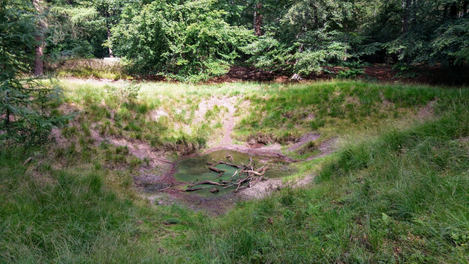 10. Na ca. 650 m, een stukje voorbij open heidegebied (rechts) eerste afslag naar rechts nemen, bosweg. U komt uit bij de Heidebloemplas.